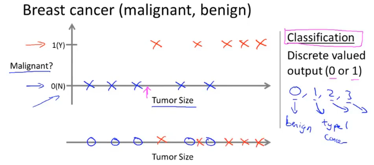分类问题是预测离散值输出,例如判断肿瘤是良性还是恶性。