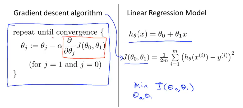 梯度下降每次更新的都需要进行偏导计算,这个偏导对应线性回归的代价函数。