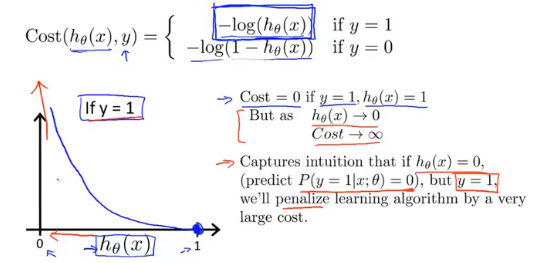 当评估模型参数对y=1(恶性肿瘤)进行预测的好坏时,如果实际为恶性,预测值也为1(恶性),此时的代价为0;如果实际为恶性,预测为0(良性),此时的代价为$+\infty$,这时代价函数就很好的评估了参数$\theta$的表现。