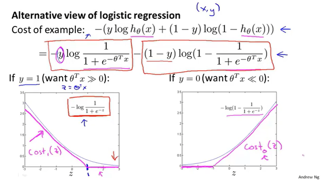 支持向量机在逻辑回归的基础上简化了代价函数,逻辑回归使用正则项来权衡$\theta$的大小,以此解决过拟合的问题。SVM也是类似,它是在代价函数上添加系数C,效果等价。