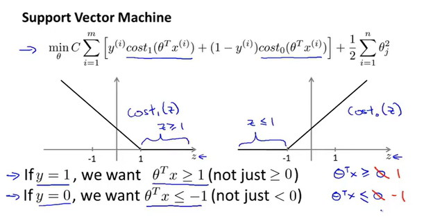 SVM又叫做最大边界分类问题,观察代价函数可以得到: