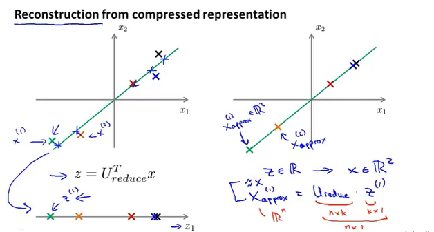 主成分分析(PCA)是一种数据压缩的算法,他将数据压缩到k维度,并使得所有数据投影到新维度的距离最小。