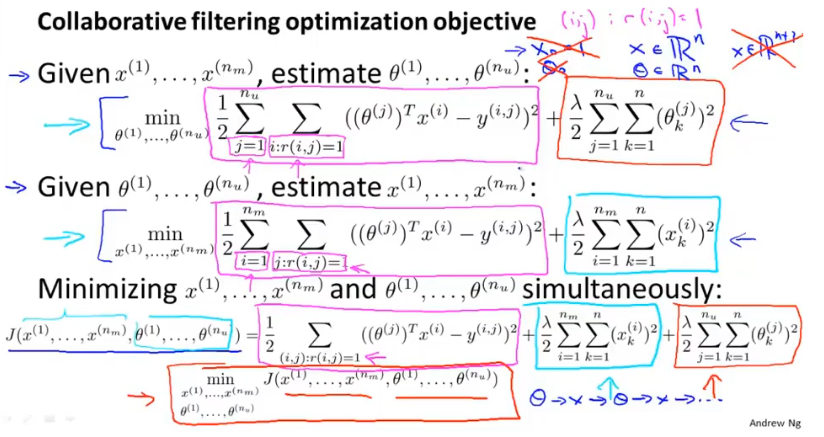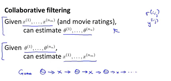 根据特征向量$X$可以通过线性回归得到用户的$\theta$向量,通过用户提供的$\theta$向量可以估计每部电影的特征数值。这就有点像鸡和蛋的问题。