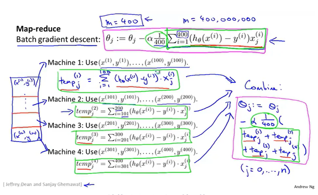 Map-reduce利用了线性回归求和运算的特性,将GD对整个数据的求和处理,分摊到多个服务器上执行,最后各个服务器把结果汇总到一起进行合并。