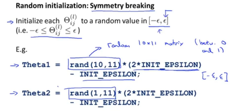 在对神经网络进行训练时,theta的取值要随机取值,如果都赋值为0,就会使得每一层的输出值、误差相同,从而存在大量冗余。
